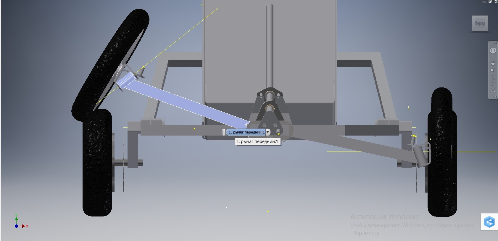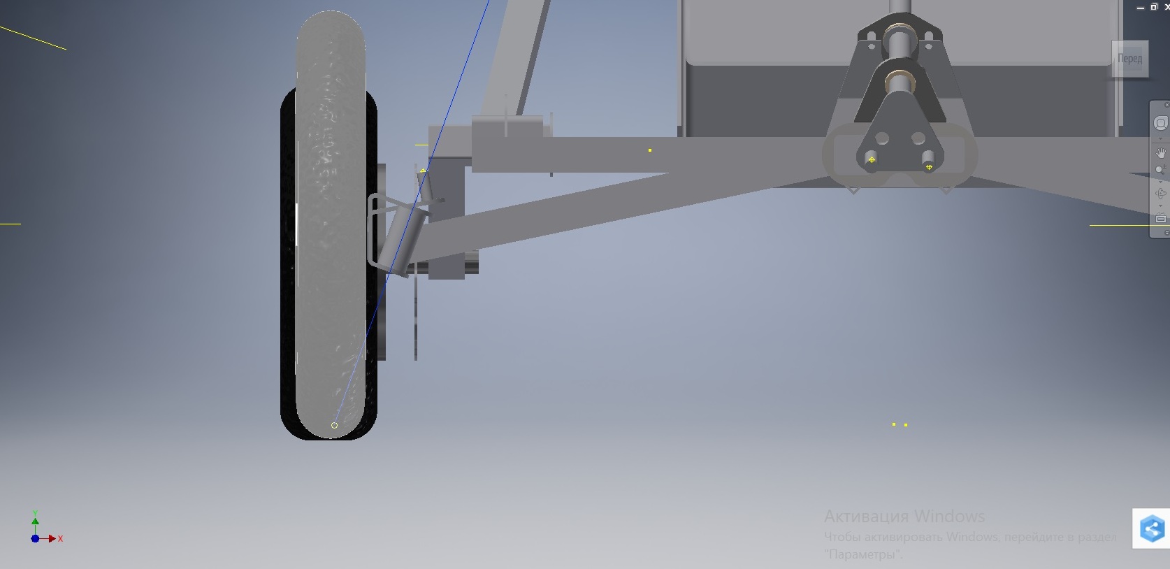 Плечо обката нулевое, ось завалил на 20 градусов, чтоб в руль не било. Паразитное подруливание постарался свести к минимуму. Для этого ось рулевых тяг опустил на уровень ось рычагов. Узел передней подвески разборный, на лазере нарезанный