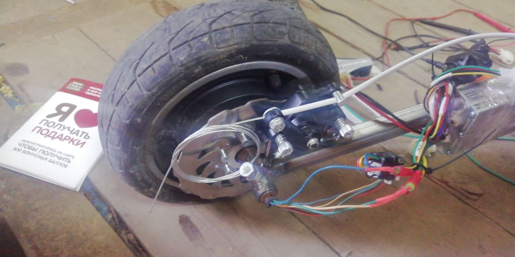 Тормоза дисковые на задние колеса, привод тросовый. На педаль тормоза поставил концевик, чтоб отключал двигатель при торможении. Руль компьютерный. Буду добавлять каркас безопасности.