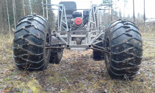 Прокачка подвески без пружины отличная (на данный момент). Как будто при новой схеме(вариант 2) слабая пружина для общего веса.Она сжалась,и рычаги просели вверх.Менял на новые пружины,эффект тот же.При прокачке общего веса,вся подвеска валкая (слабая),практически руками качаешь как колыбель,без сопротивления.Общий вес около тонны.Скорей всего -причина слабая пружина.А первый вариант подвески работал неправильно.Вездеход на задней подвеске стоял на ,,цыпочках,,.Нижние рычаги работали на отбой.Или может стойки поставить вертикально? Вот одно фото сохранилось с вариантом 1,небольшой наезд на бугор.