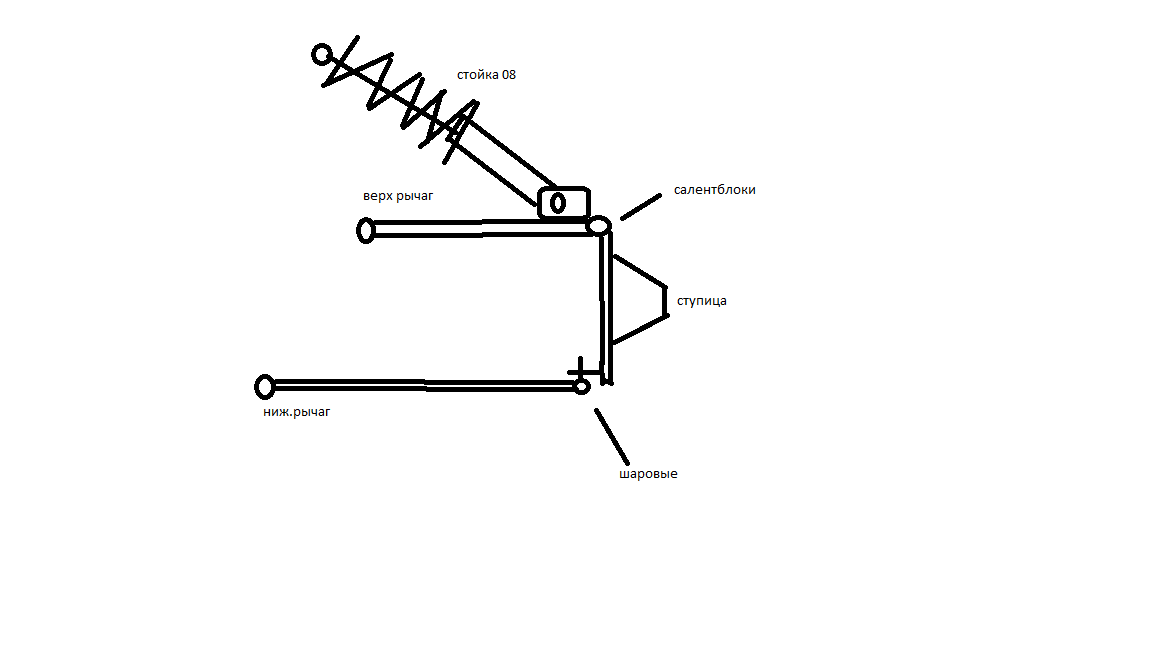 Чтобы было точней,то вот первоначальная схема.Стойка задняя 08 с родной пружиной стояла в корпусе передней стойки 08.Этот гибрид шарнирно укреплен на верхнем роге кулака.Верхний рычаг играл функцию стабилизатора кулака чтобы меньше болтало,колесо не маленькое.А рвало сайленты, из за неправильного крепления верхнего рычага.Сейчас уже понемногу доходит,если стойка укреплена на конце плеча кулака( как в первом варианте), то жесткости родной пружины хватает.Если относить подальше от кулака,то уже жесткости не хватает.А есть примеры как переделывают стойку 08 ,для большей пружины,там ведь другие чашки?