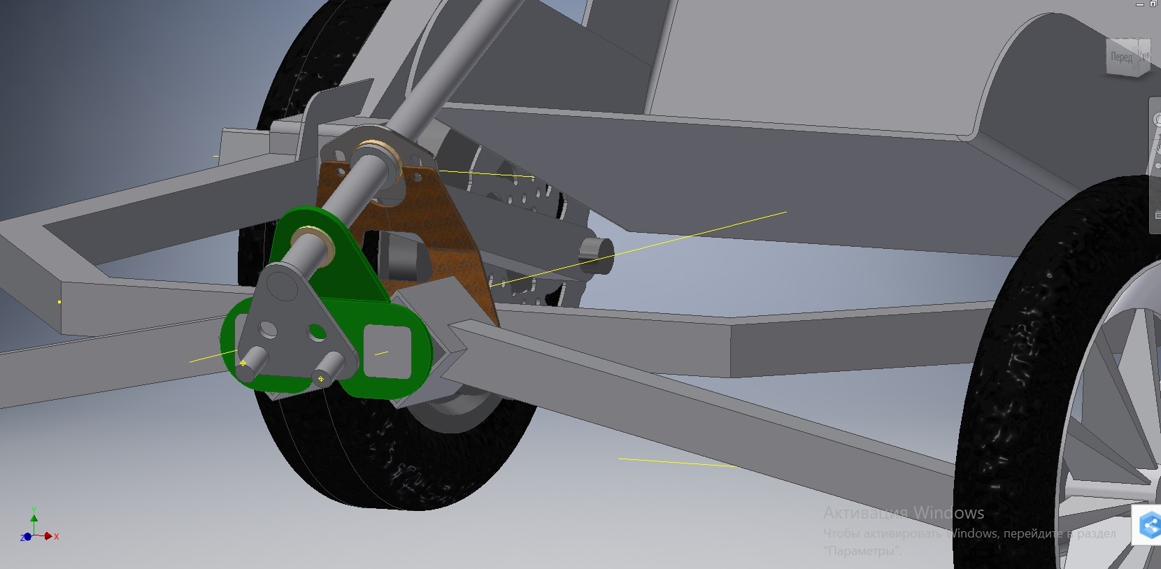 Плечо обката нулевое, ось завалил на 20 градусов, чтоб в руль не било. Паразитное подруливание постарался свести к минимуму. Для этого ось рулевых тяг опустил на уровень ось рычагов. Узел передней подвески разборный, на лазере нарезанный