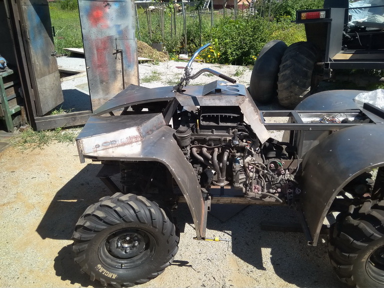 Обшивка металл 1 мм, оптика Wesem (Польша), лебедка стационарно сзади, съемная спереди, музыка из сантех труб, приборка вся лодочная влагозащищенная, частью из поднебесной, часть из "1000 Размеров", тахометр и датчик температуры от Defi или что-то типа того. Покраска всего добра в раптор, как смог. Это делал в первый раз.
